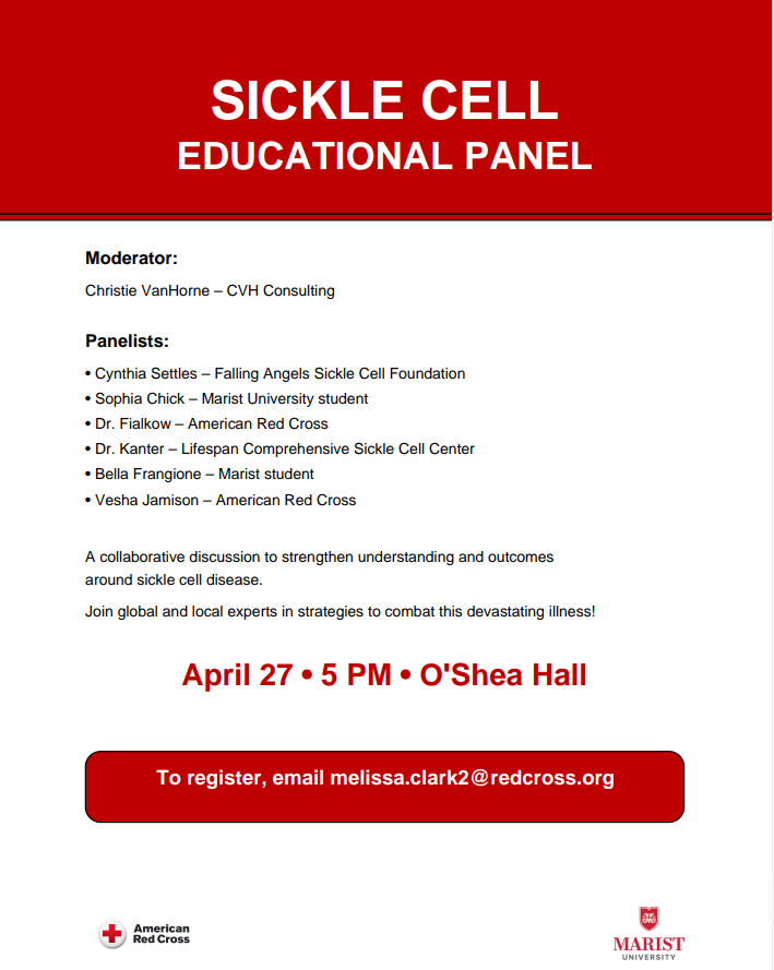 A collaborative discussion to strengthen understanding and outcomes around sickle cell disease hosted at Marist University, O'Shea Lecture Hall in Poughkeepsie, NY on Monday, April 27th, 5pm. Virtual option available (must register in advance to receive link). Join global and local experts in strategies to combat this devastating illness. To register, please email Melissa.clark2@redcross.org by 4/15.