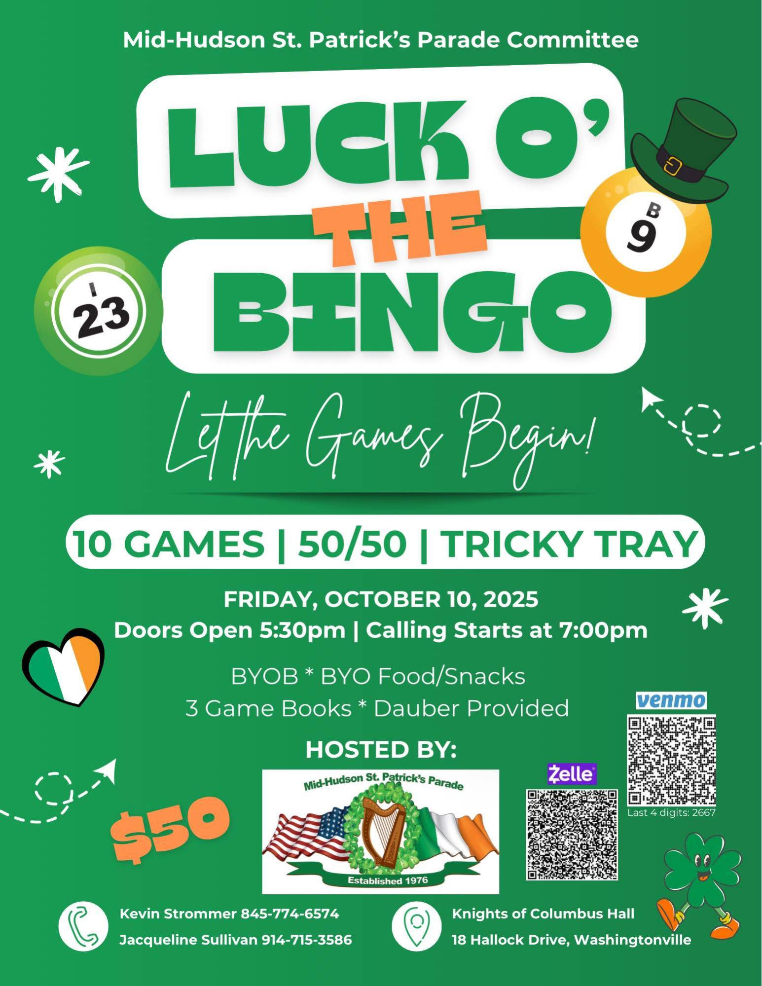 Luck O' The Bingo. 10 Bingo Games. 50/50 Tricky Tray Entry fee $50.00