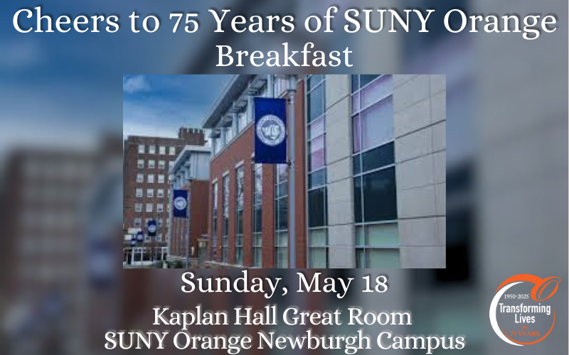 Wrap up an unforgettable weekend by joining us for a special breakfast event as we continue to celebrate 75 years of SUNY Orange. Enjoy a delicious breakfast, reconnect with classmates, tour the Newburgh campus, hear exciting updates from the college, and take part in a memorable presentation celebrating our proud history and bright future.
